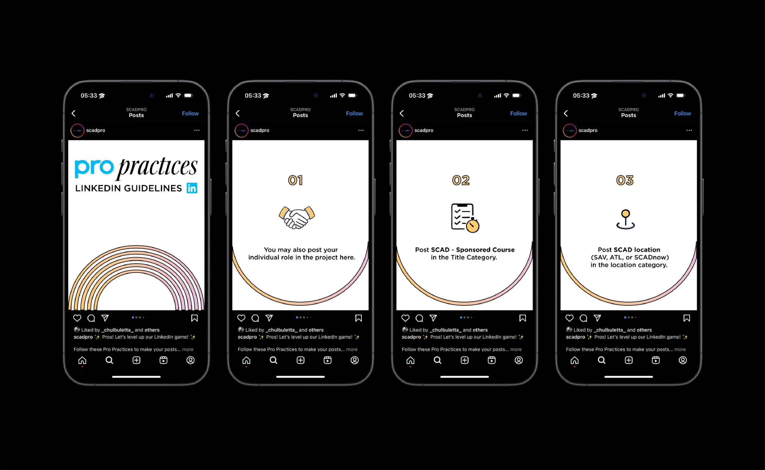The head of SCADpro tasked our class with rebranding the SCADpro Instagram page. Our approach to the project was centered on the concept of “Approachable Professionalism”, striking a balance between an engaging, dynamic feed and a polished, professional presence.