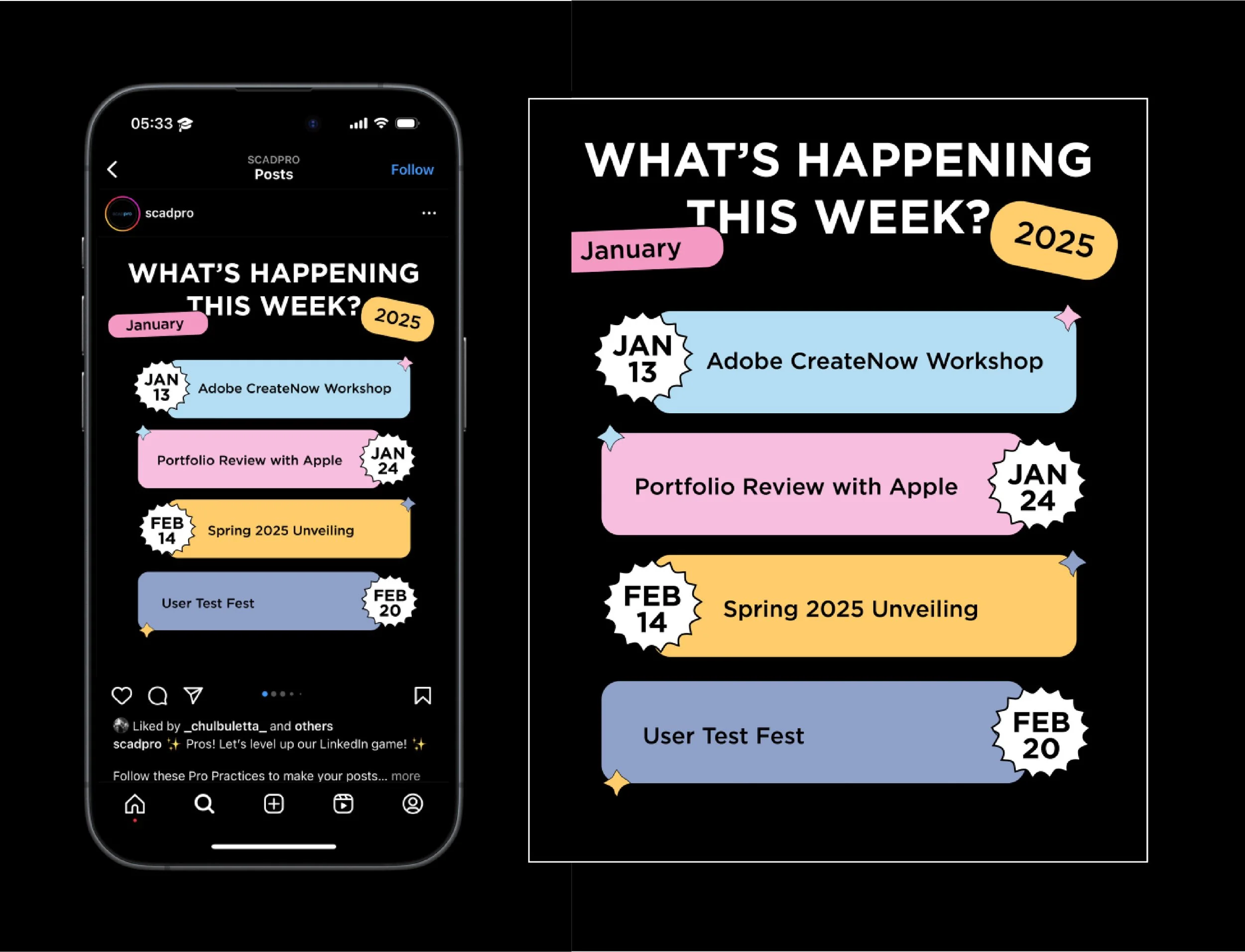 During the research phase, we conducted competitor analysis and strategic design research, providing recommendations for the rebrand. We also analysed key insights from SCADpro’s existing Instagram page to identify opportunities for growth and refinement.